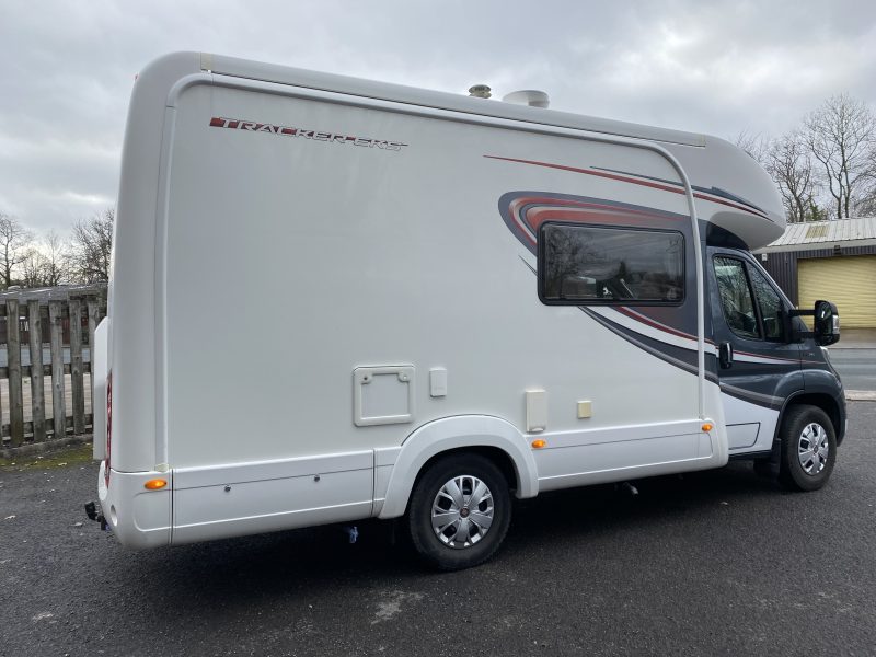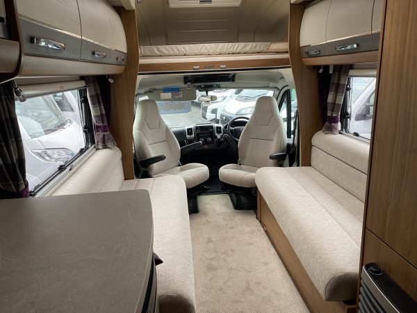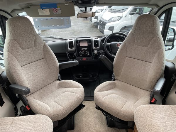 This Autotrail Tracker EKS used motorhome is based on the Fiat Multi-jet 2.3 litre Automatic With Only 15k miles, The interior has two fixed single beds with a front lounge overcab double bed, the End kitchen area consists of a large fridge freezer, mixer taps and sink, microwave, gas oven and grill with both gas and electric hobs and a large amount of storage space. Has a rear washroom with separate shower cubicle and Thetford flushable toilet, Alde hot water central heating, alloy wheels, central locking, reversing camera, cruise control and cab air conditioning. Also has a large front roof light, swivelling captain front seats, TV and aerial, window blinds and fly screens all around.