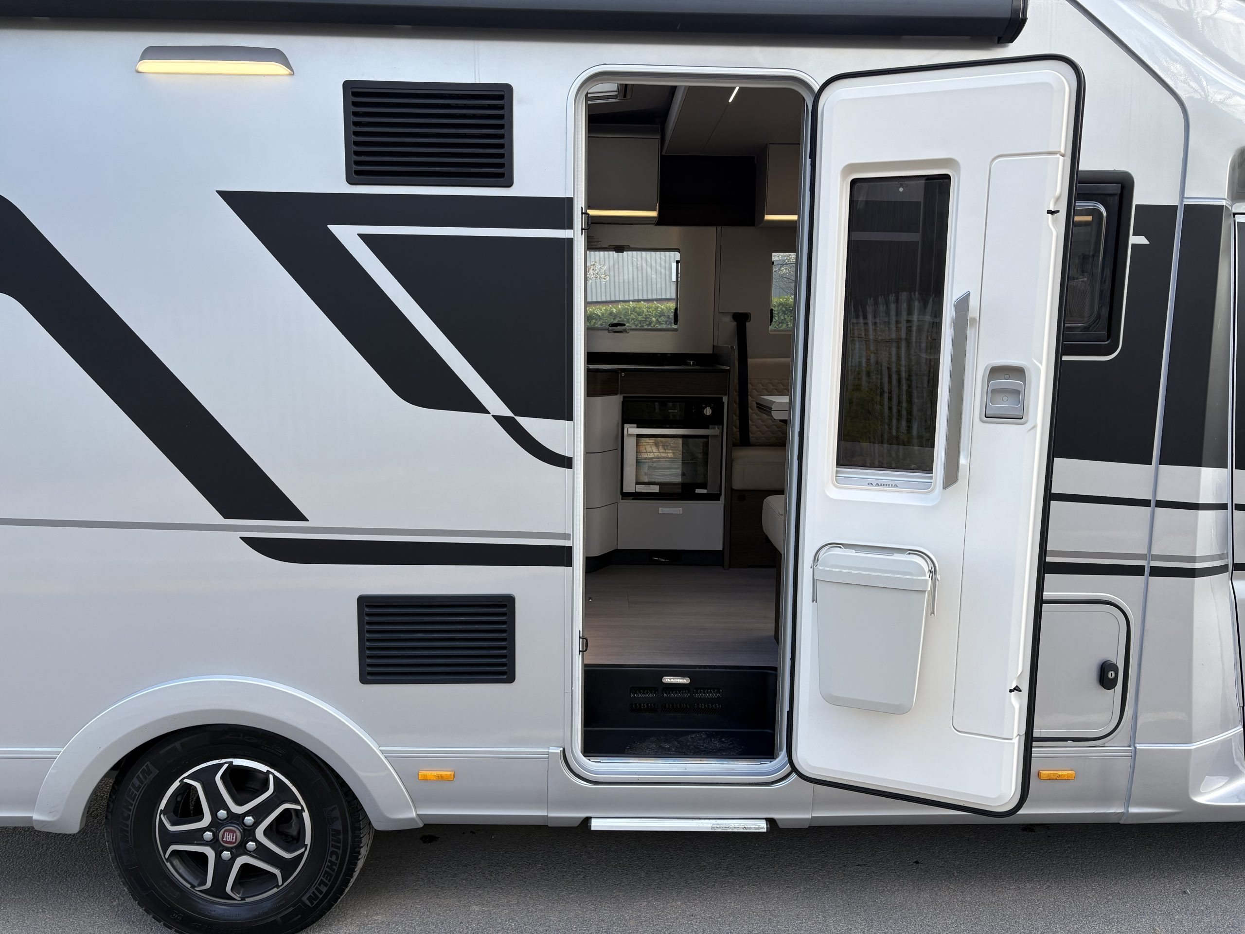 Also has a spacious garage area for ample storage. Specification includes the Adria All Inclusive Pack (Cab air conditioning, cruise control. Front Fog Lights, Awning, Reverse Camera) and the Adria Luxury Pack (Sat Nav Media System, Awning, Alloy Wheels, U Connect, Leather Steering Wheel,& Gear Knob) Fiat Safety Pack ,Corner Steadies, Solar Panel ALDE Heating system with ALDE Heat exchanger, underfloor heating and much more.