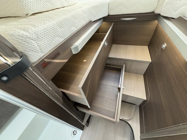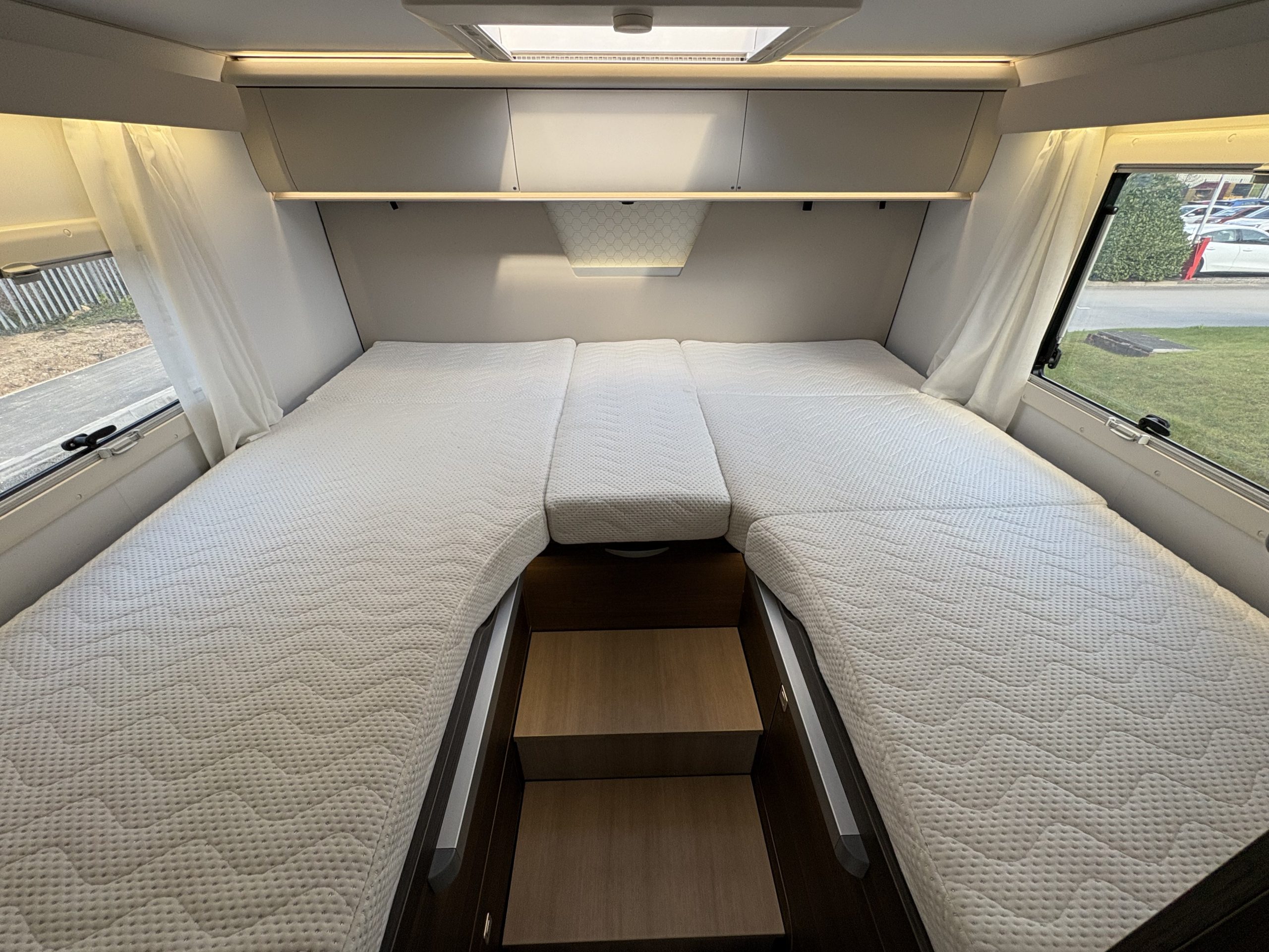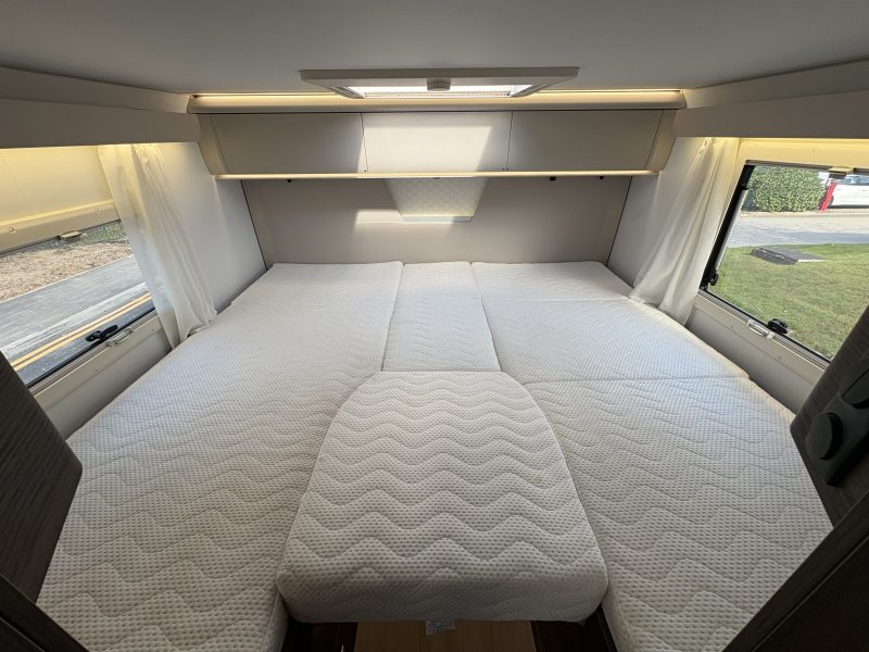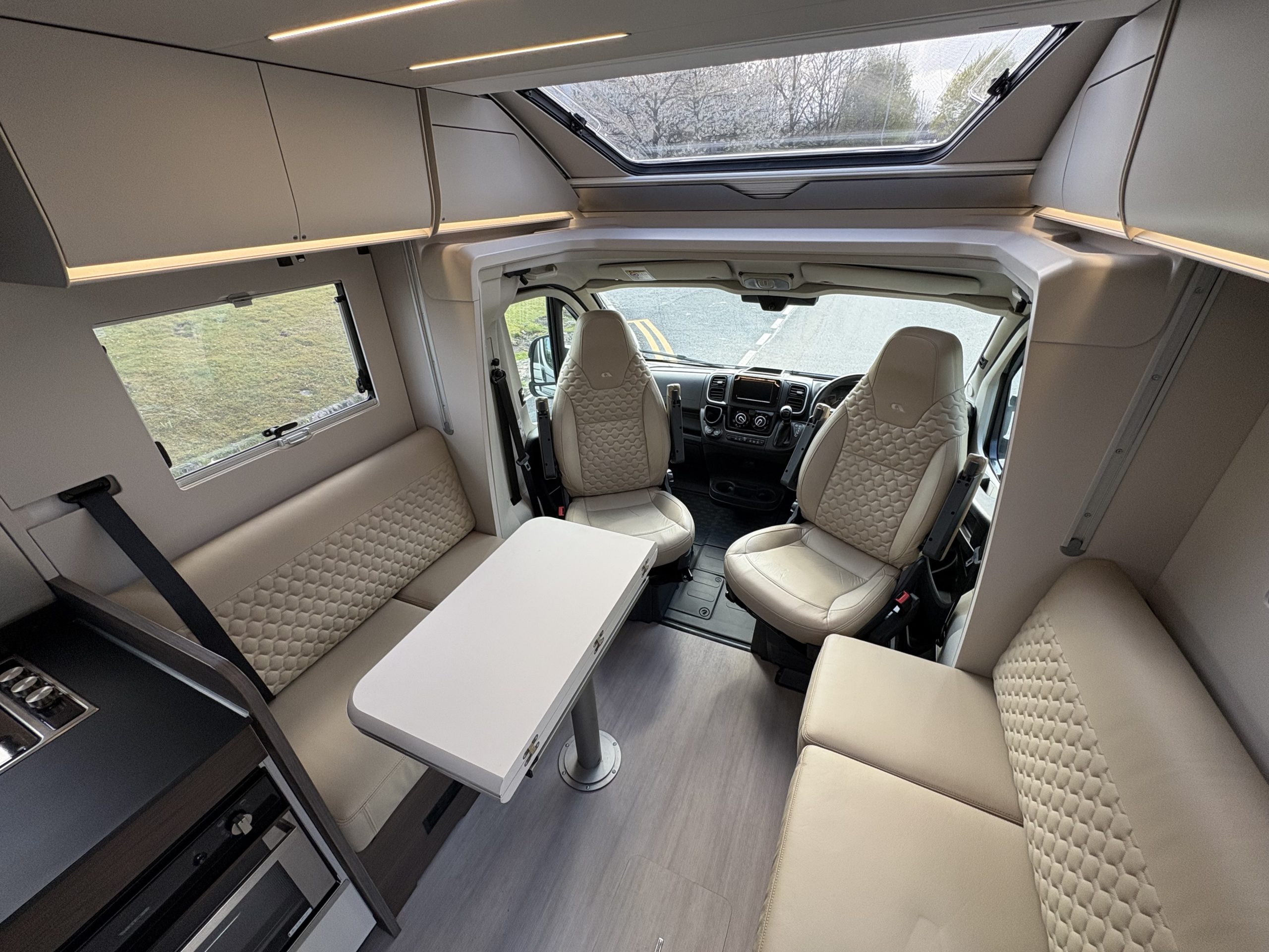 Charles Leather interior. It also has 4 travelling seats and is a 4 berth with a two large twin beds that convert easily into a double bed in the rear bedroom. This configuration gives a spacious Face to Face dinette area.