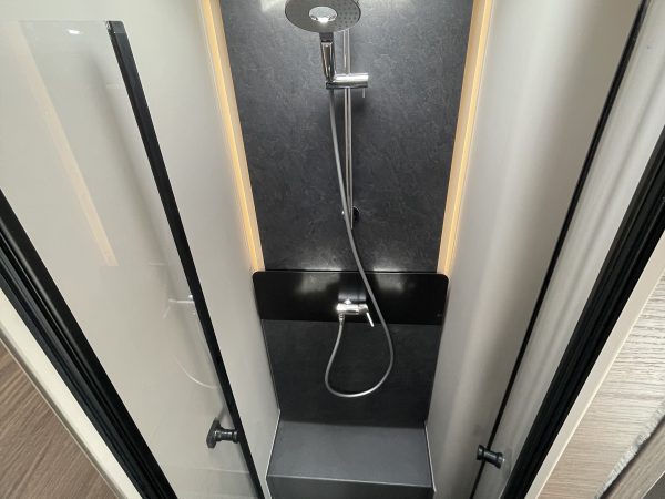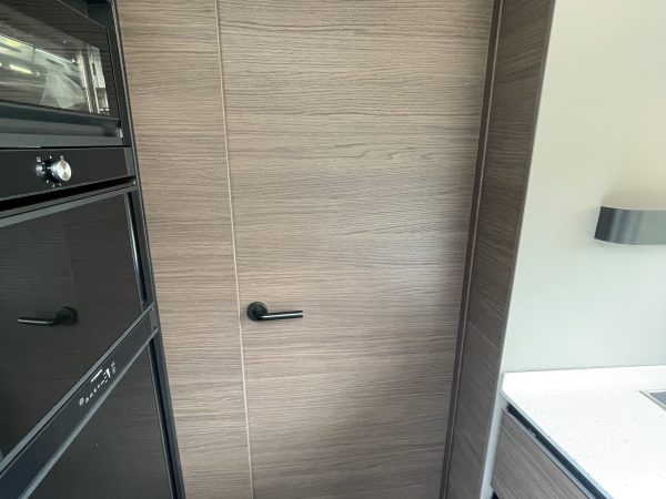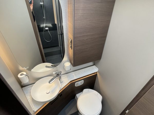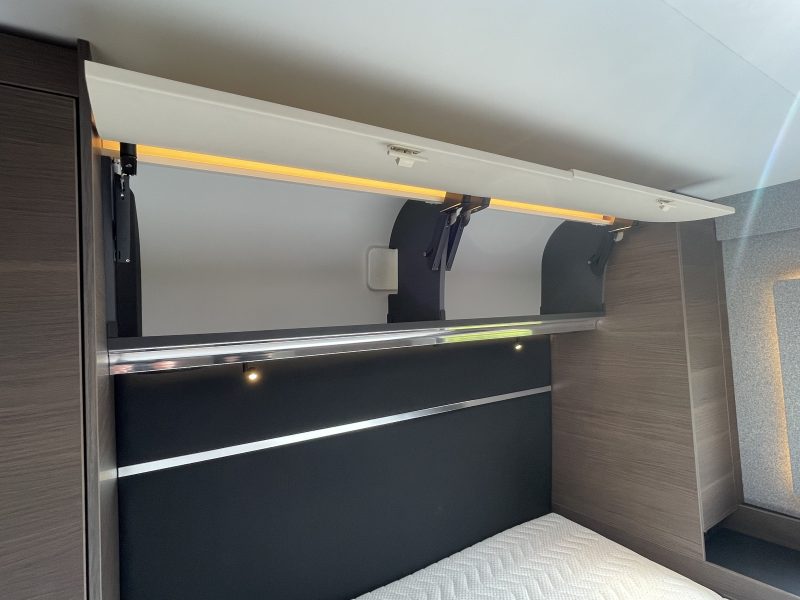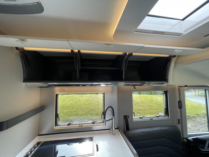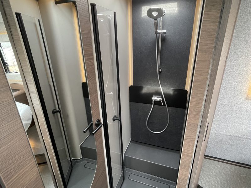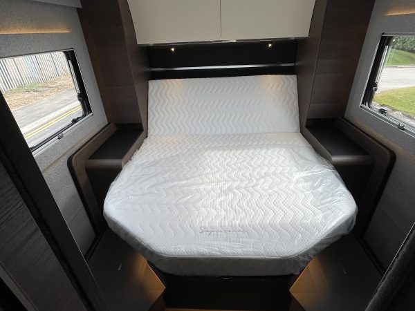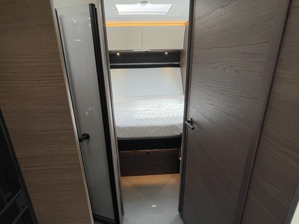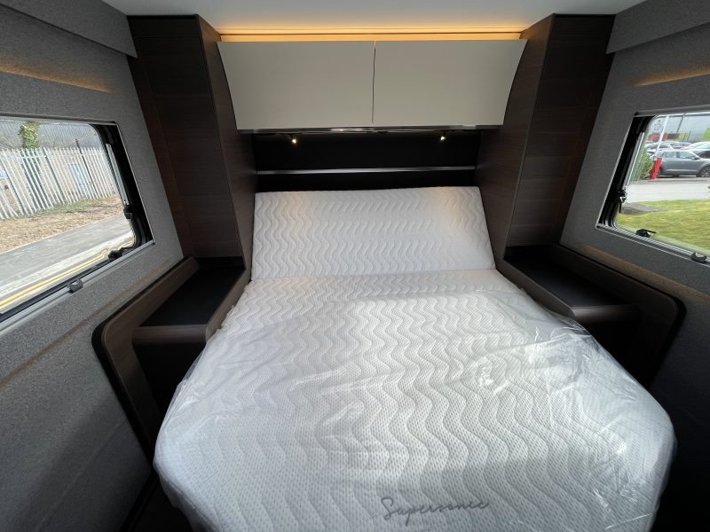 Finished in full “EDWARD” Leather (Black), this popular 780 DC layout consists of a large electric over-cab bed and a spacious rear bedroom with a large central island bed, featuring a fully equipped kitchen, a spacious living area, a luxurious bedroom, and a premium bathroom with a separate shower, all designed for maximum comfort and convenience on the road