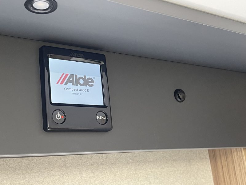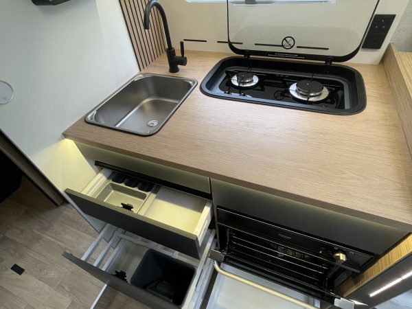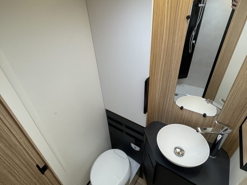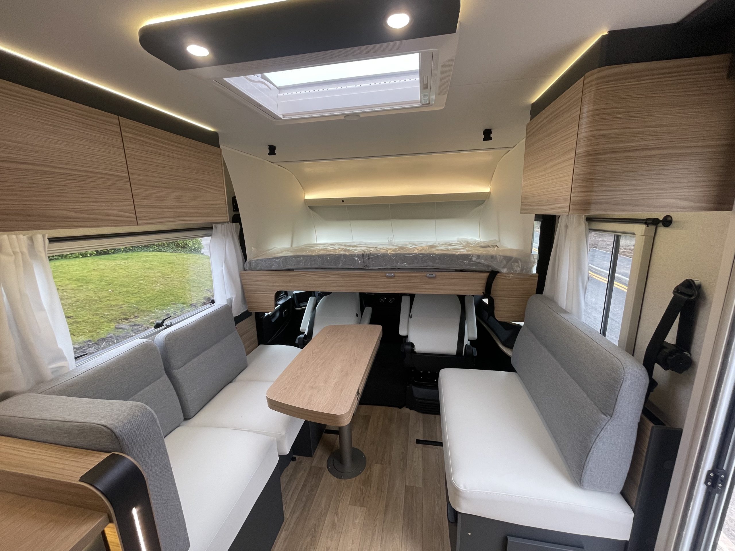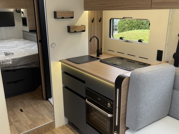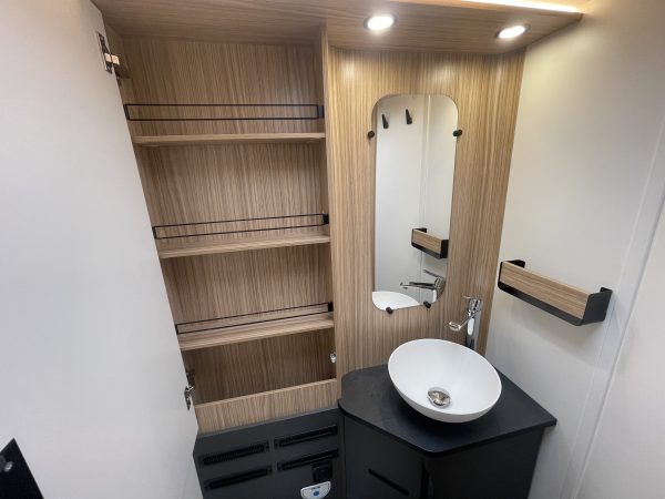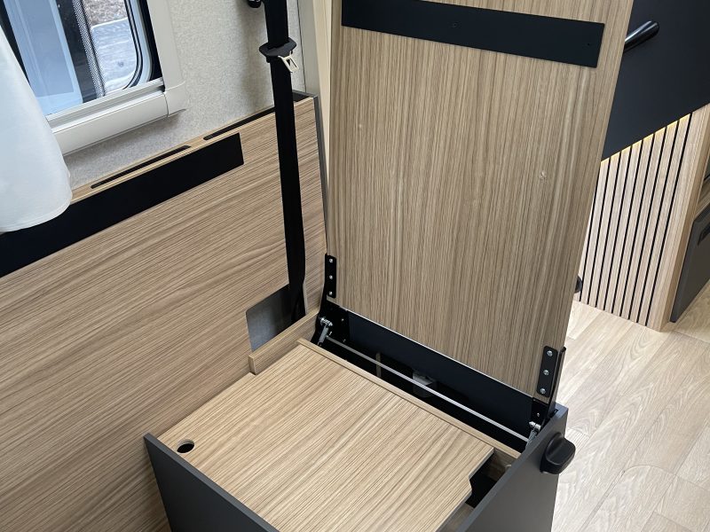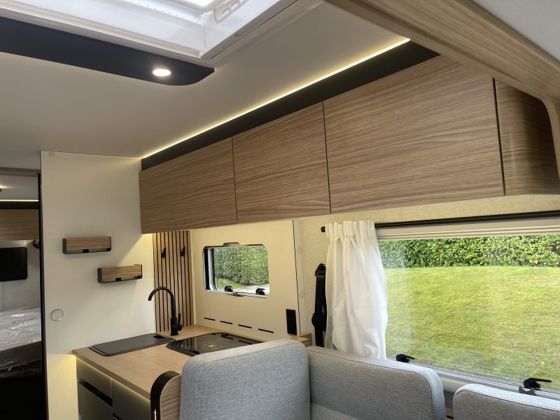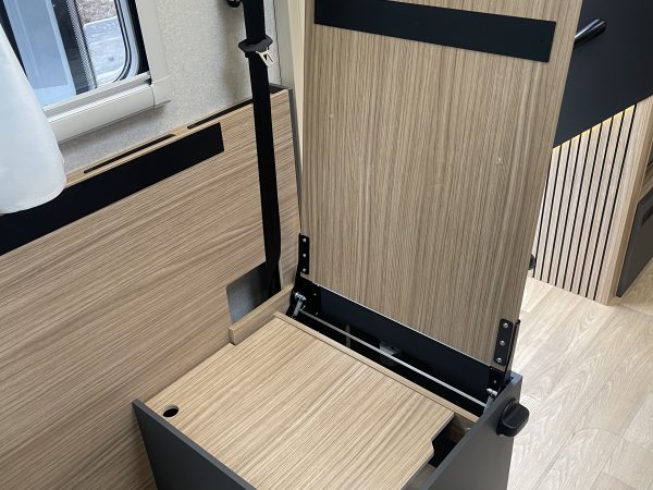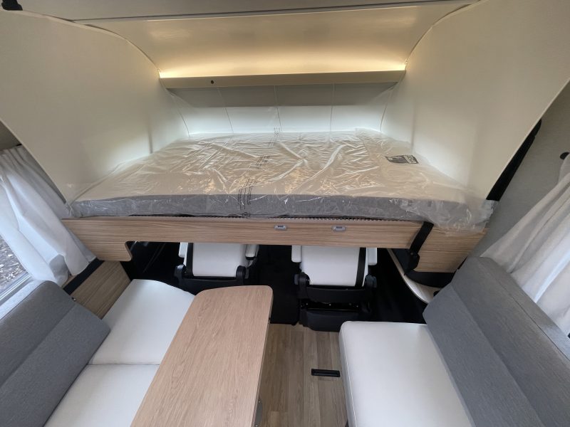 Two large bench seats face each other in this beautifully finished living room. In the centre, a large folding table seats 5. The elegance of the wood, the large windows and the numerous LED lights all contribute to the warm ambience of this beautiful living space. Compatible with ALDE heating, it will allow you to travel in any season.
