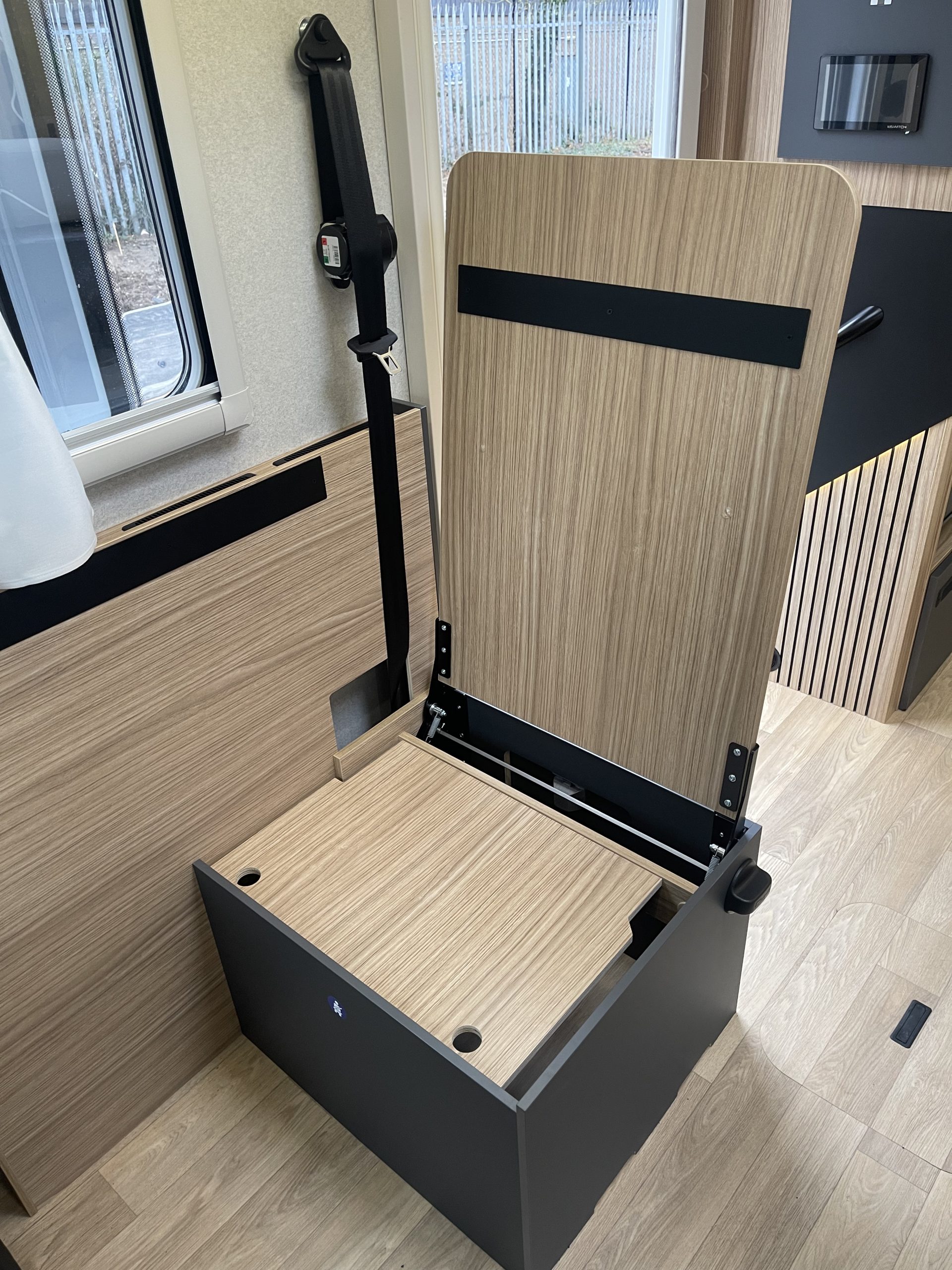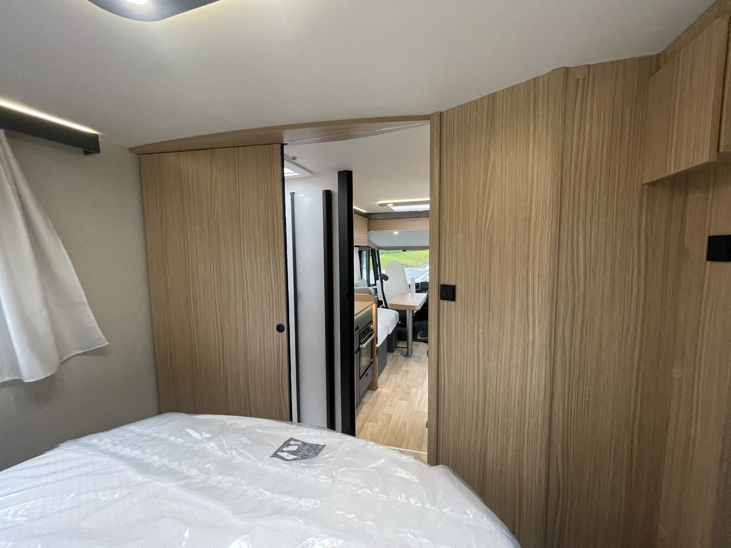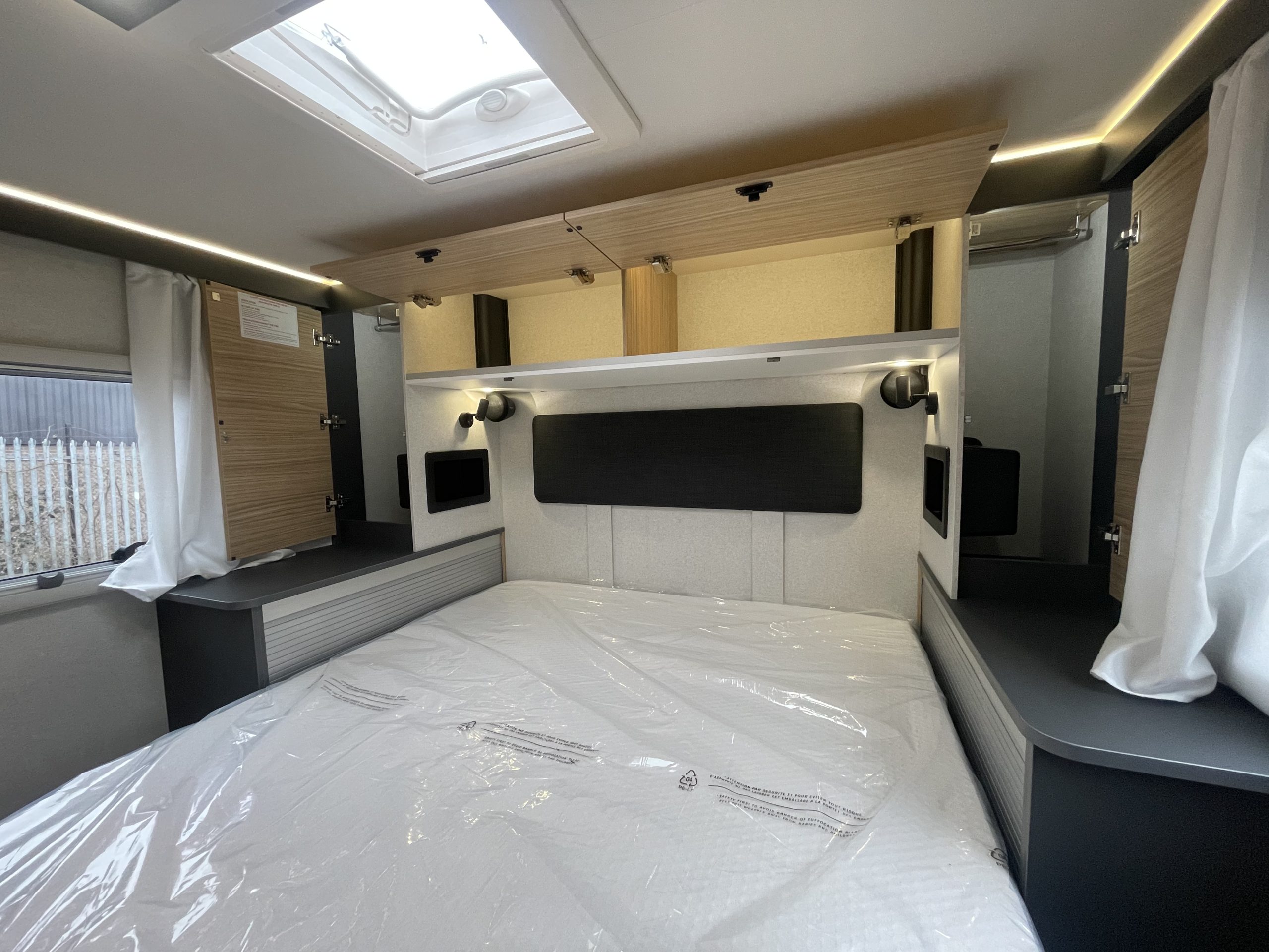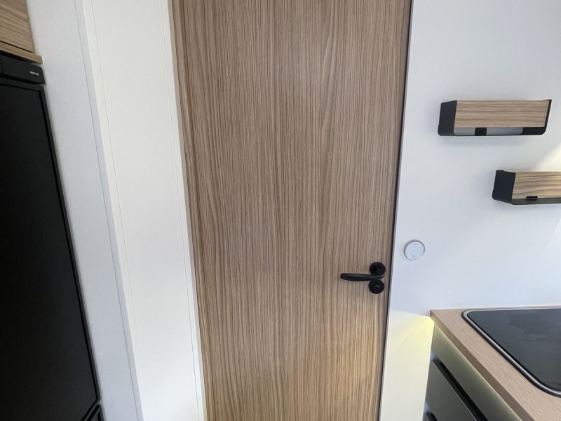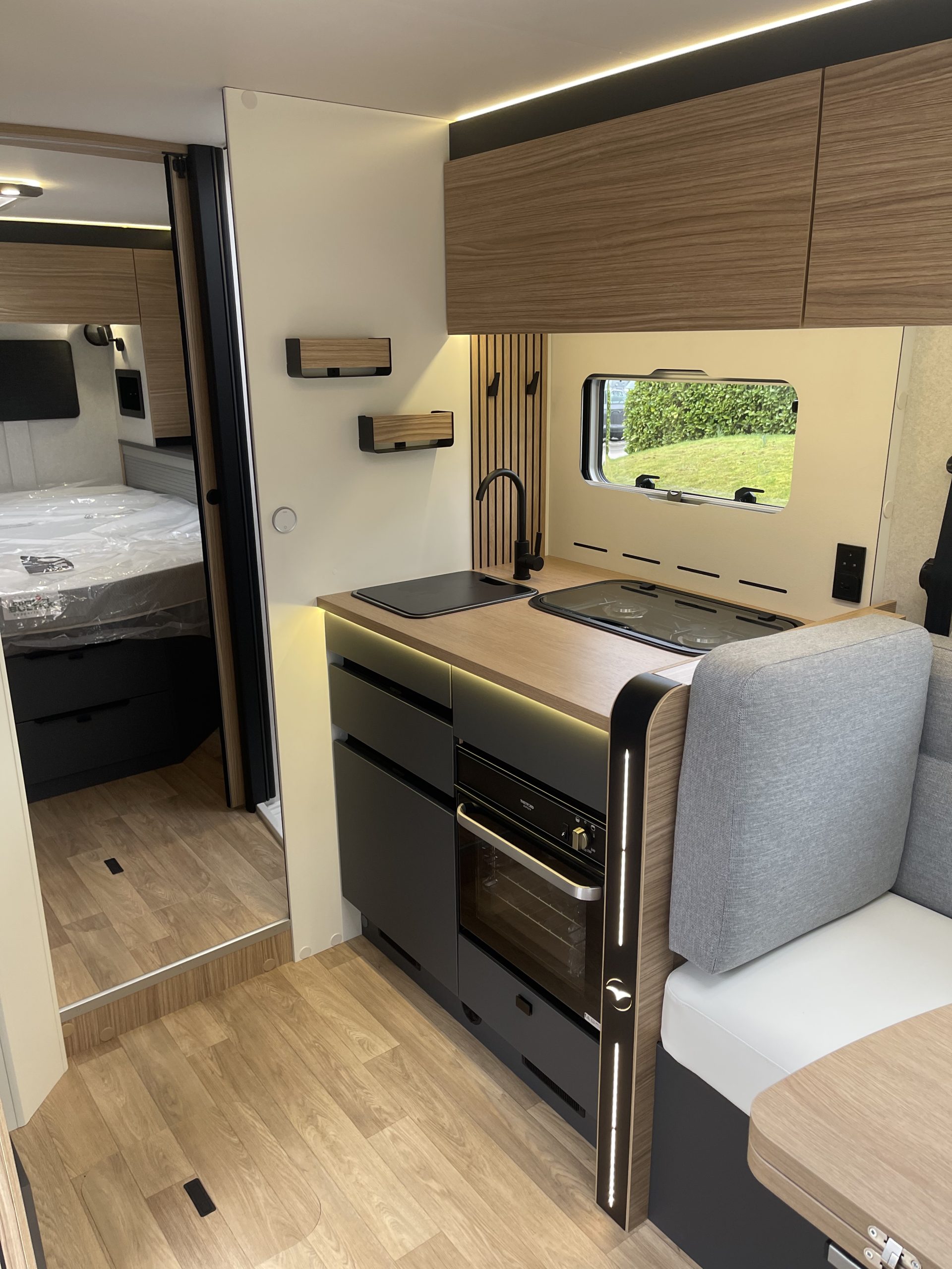 Two large bench seats face each other in this beautifully finished living room. In the centre, a large folding table seats 5. The elegance of the wood, the large windows and the numerous LED lights all contribute to the warm ambience of this beautiful living space. Compatible with ALDE heating, it will allow you to travel in any season.