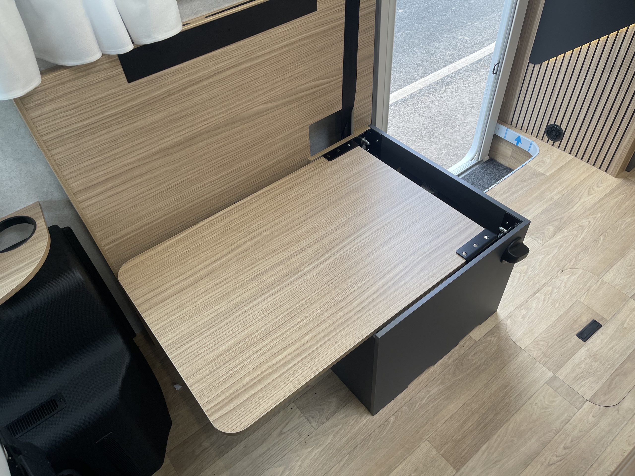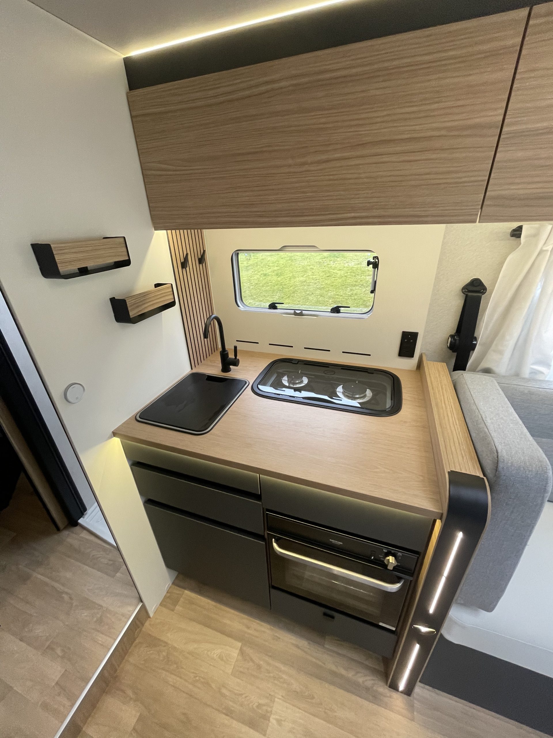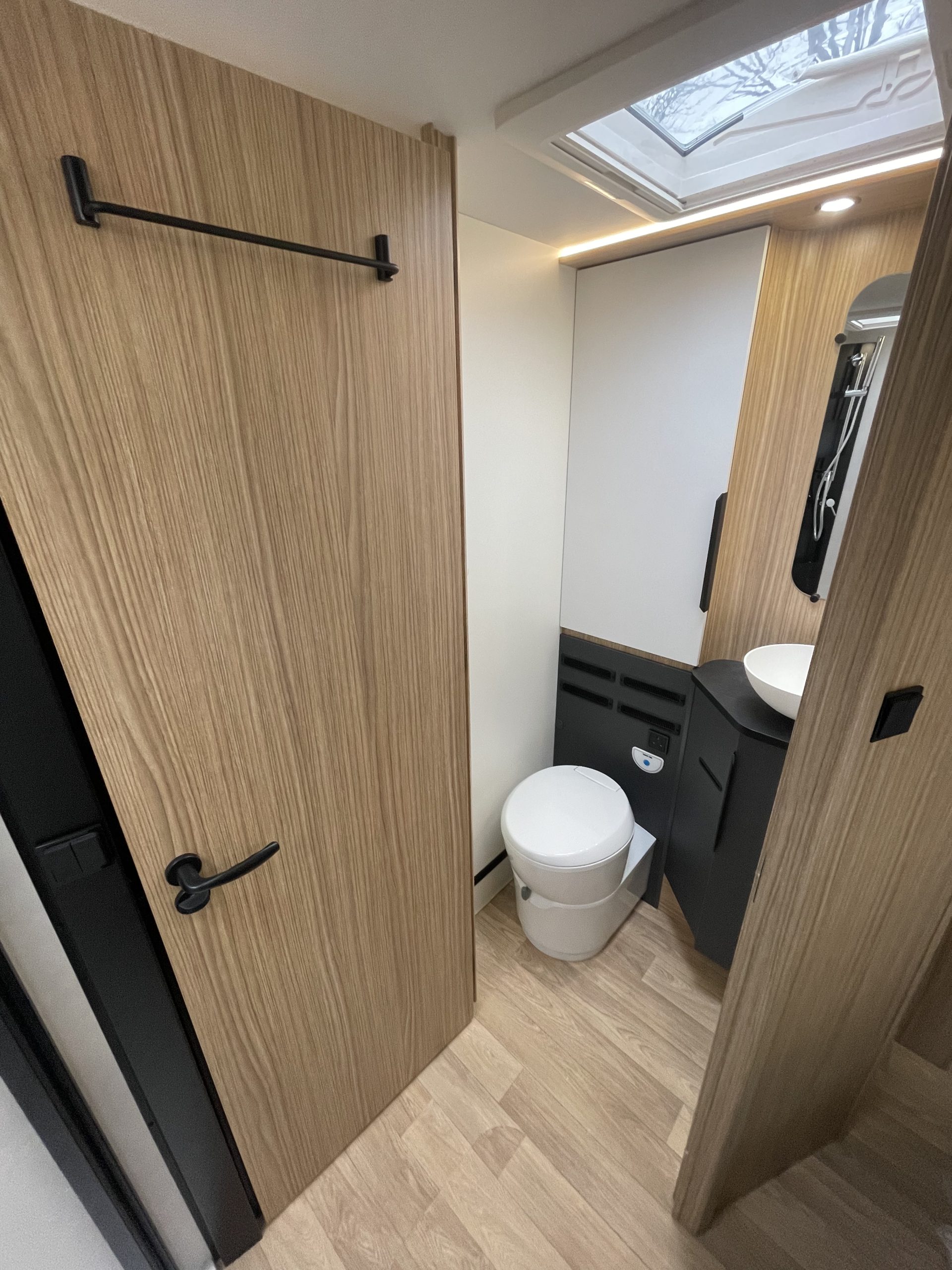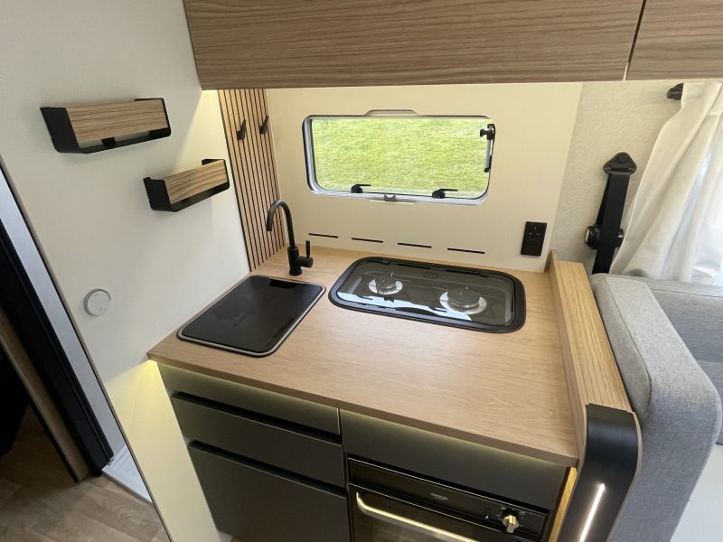 Two large bench seats face each other in this beautifully finished living room. In the centre, a large folding table seats 5. The elegance of the wood, the large windows and the numerous LED lights all contribute to the warm ambience of this beautiful living space. Compatible with ALDE heating, it will allow you to travel in any season.