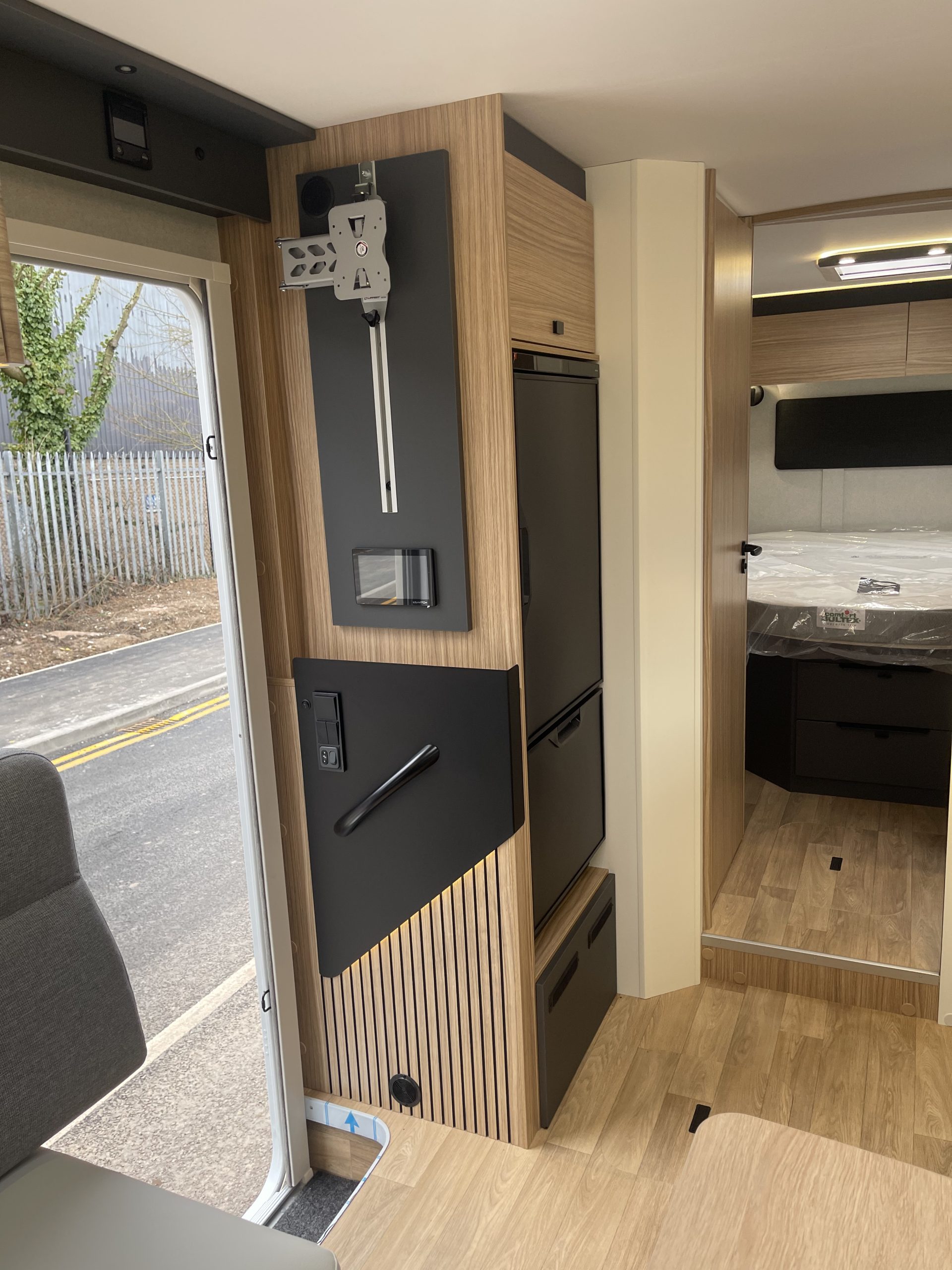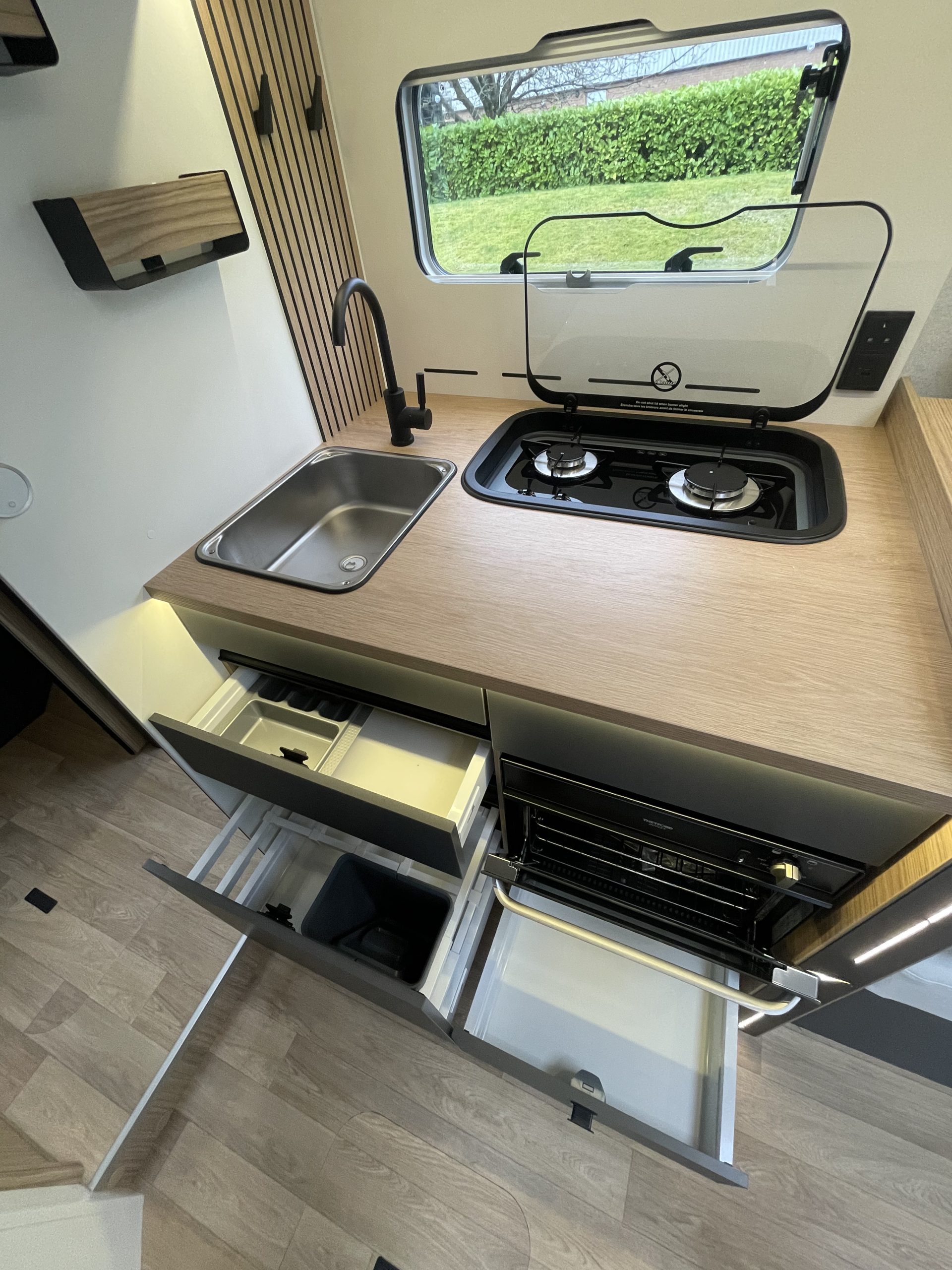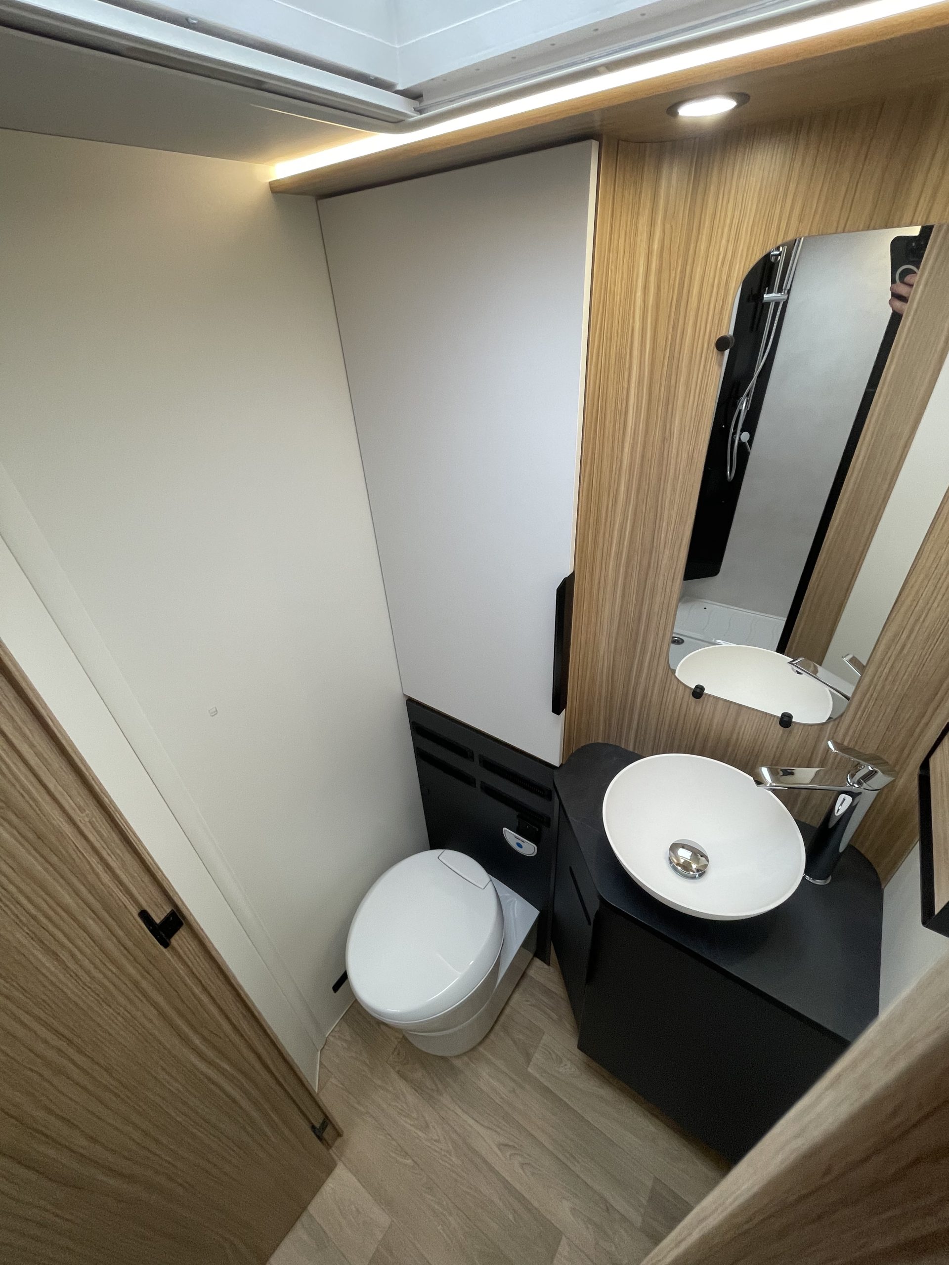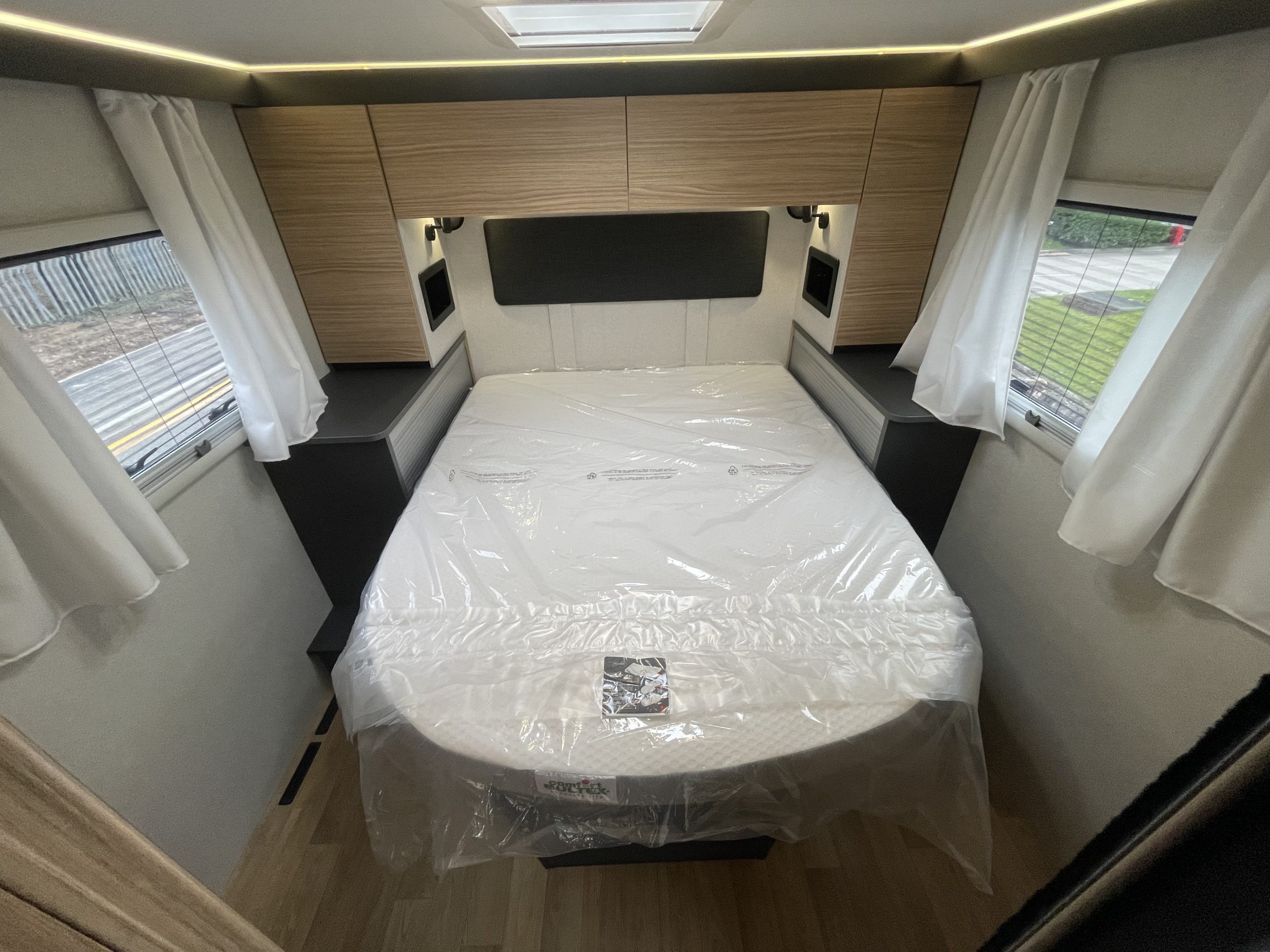 Two large bench seats face each other in this beautifully finished living room. In the centre, a large folding table seats 5. The elegance of the wood, the large windows and the numerous LED lights all contribute to the warm ambience of this beautiful living space. Compatible with ALDE heating, it will allow you to travel in any season.