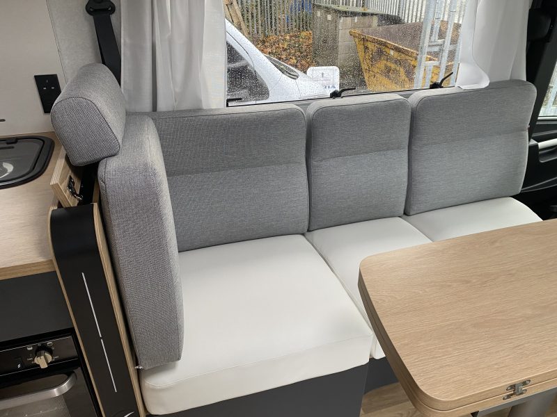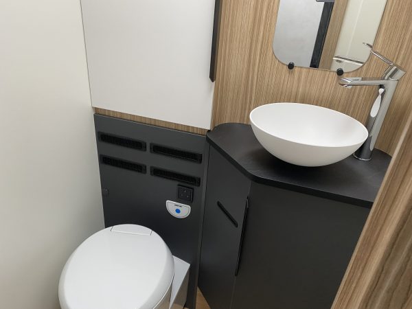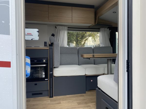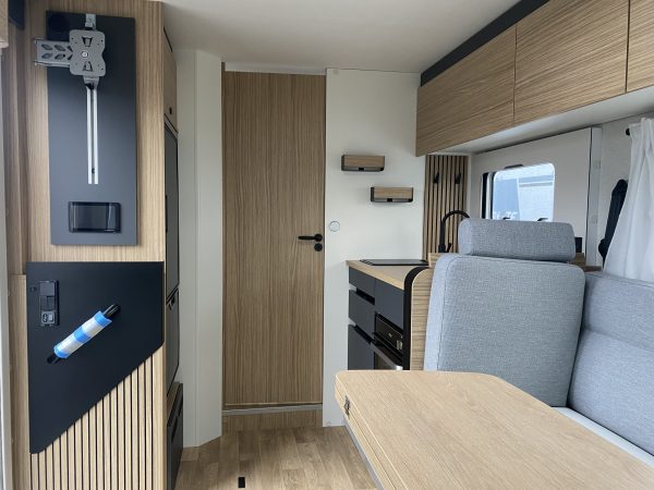 Two large bench seats face each other in this beautifully finished living room. In the centre, a large folding table seats 5. The elegance of the wood, the large windows and the numerous LED lights all contribute to the warm ambience of this beautiful living space. Compatible with ALDE heating, it will allow you to travel in any season.