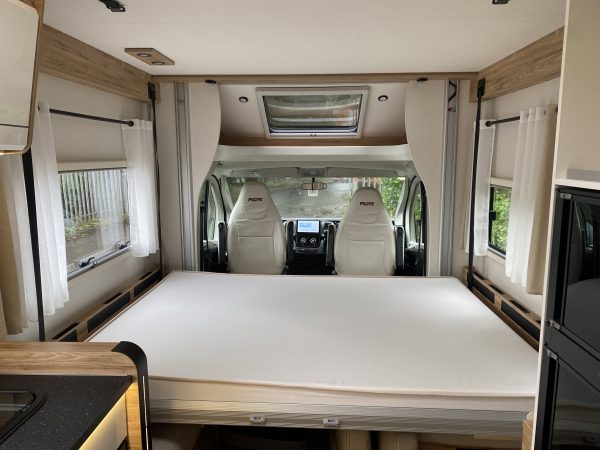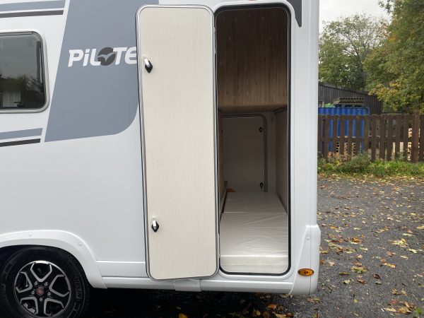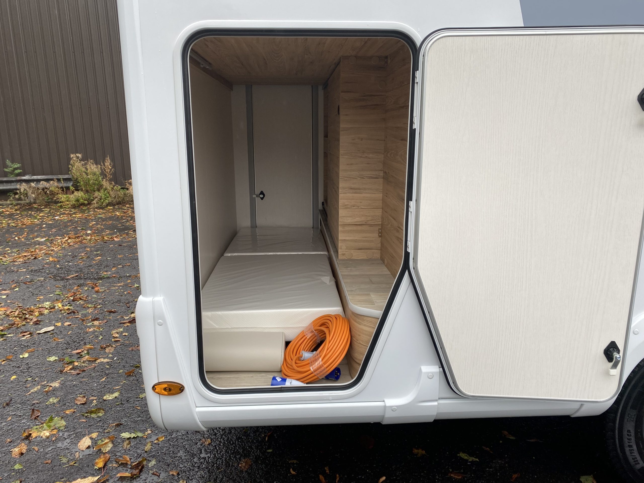 This very popular layout consists of a very large front lounge which converts easily into a double bed and with a large drop down electric double bed above gives generous sleeping space, a large rear washroom/WC with huge storage and a very large garage area.