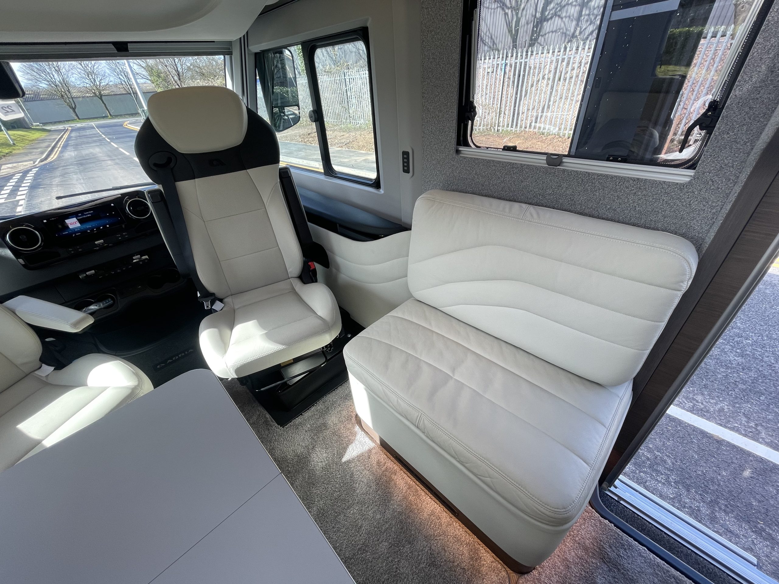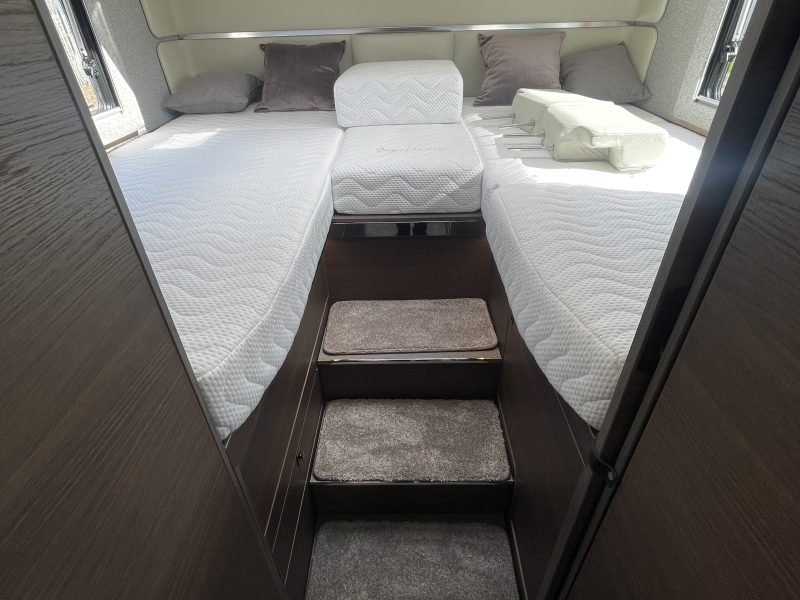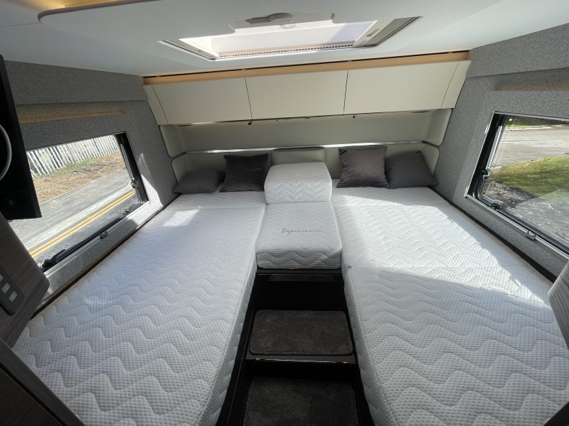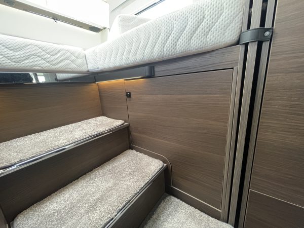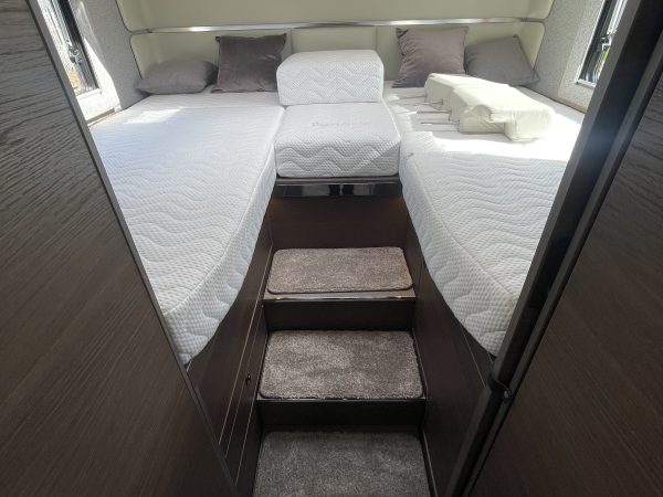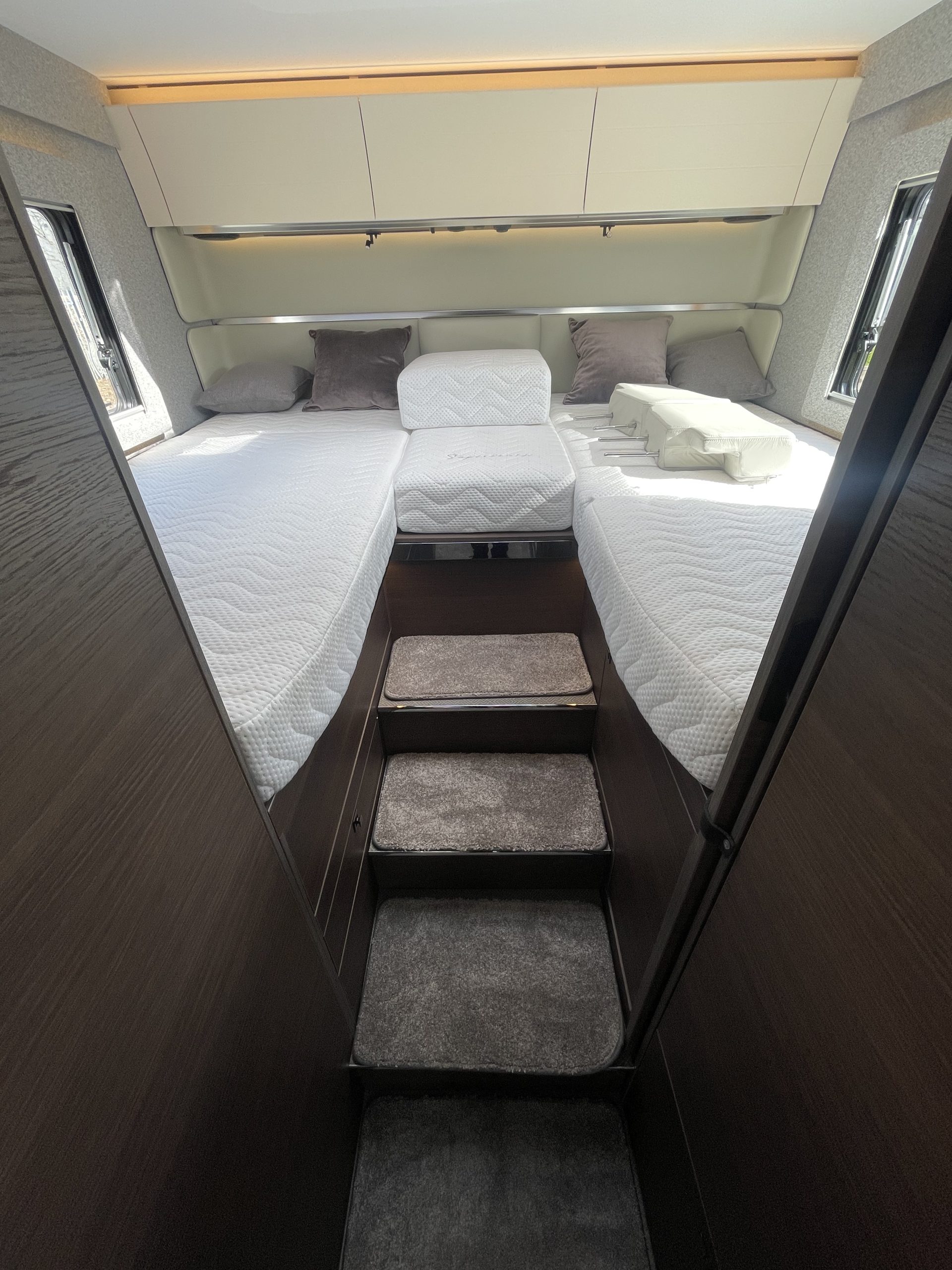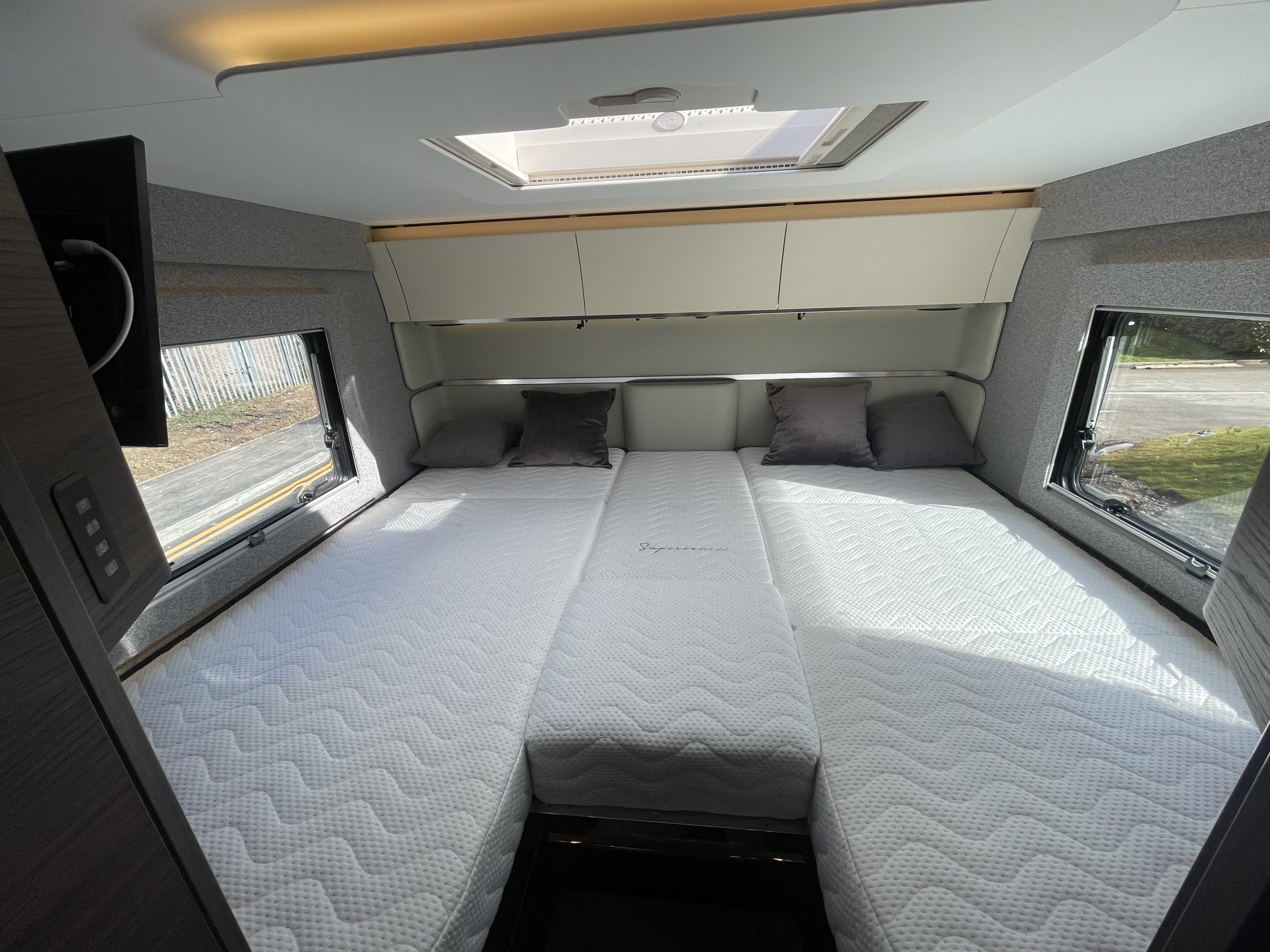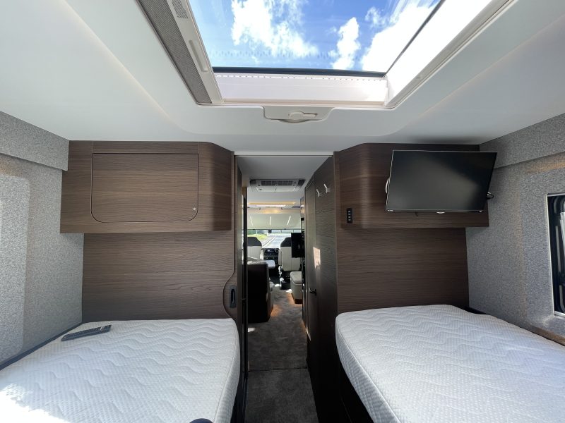 Finished in full Mathisse Leather interior this popular layout consists of a large Electric over-cab bed and a spacious rear bedroom with Twin Single beds which can be easily made up to a large double.